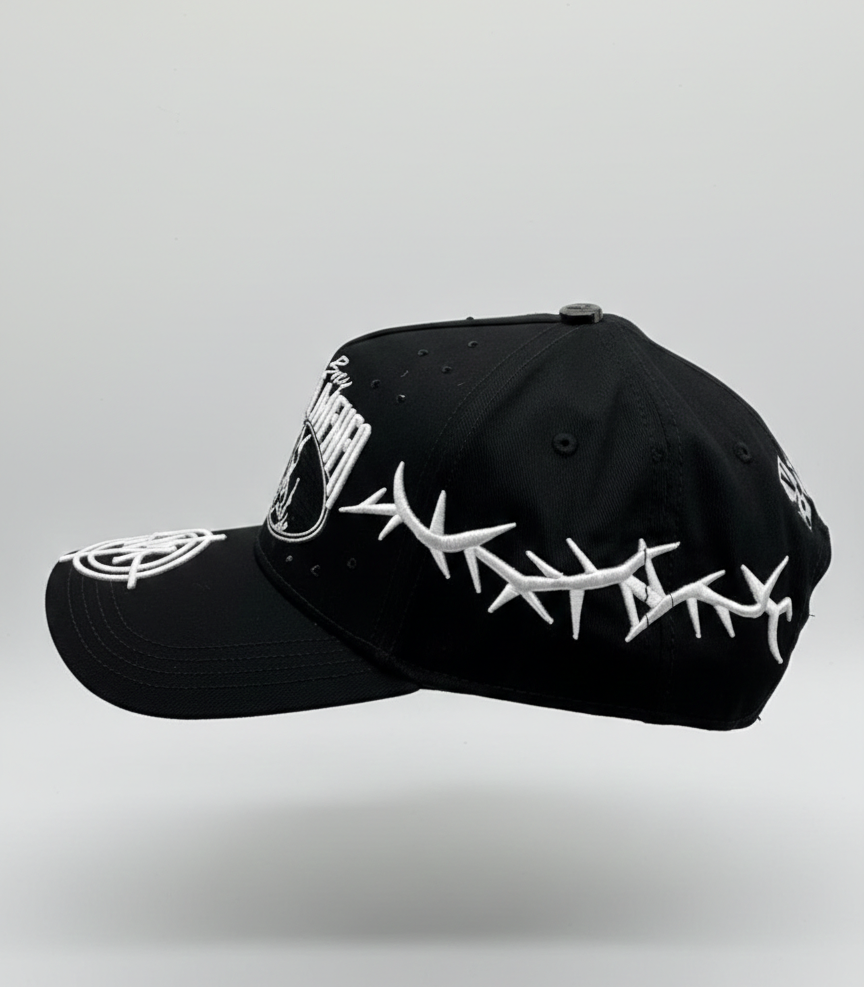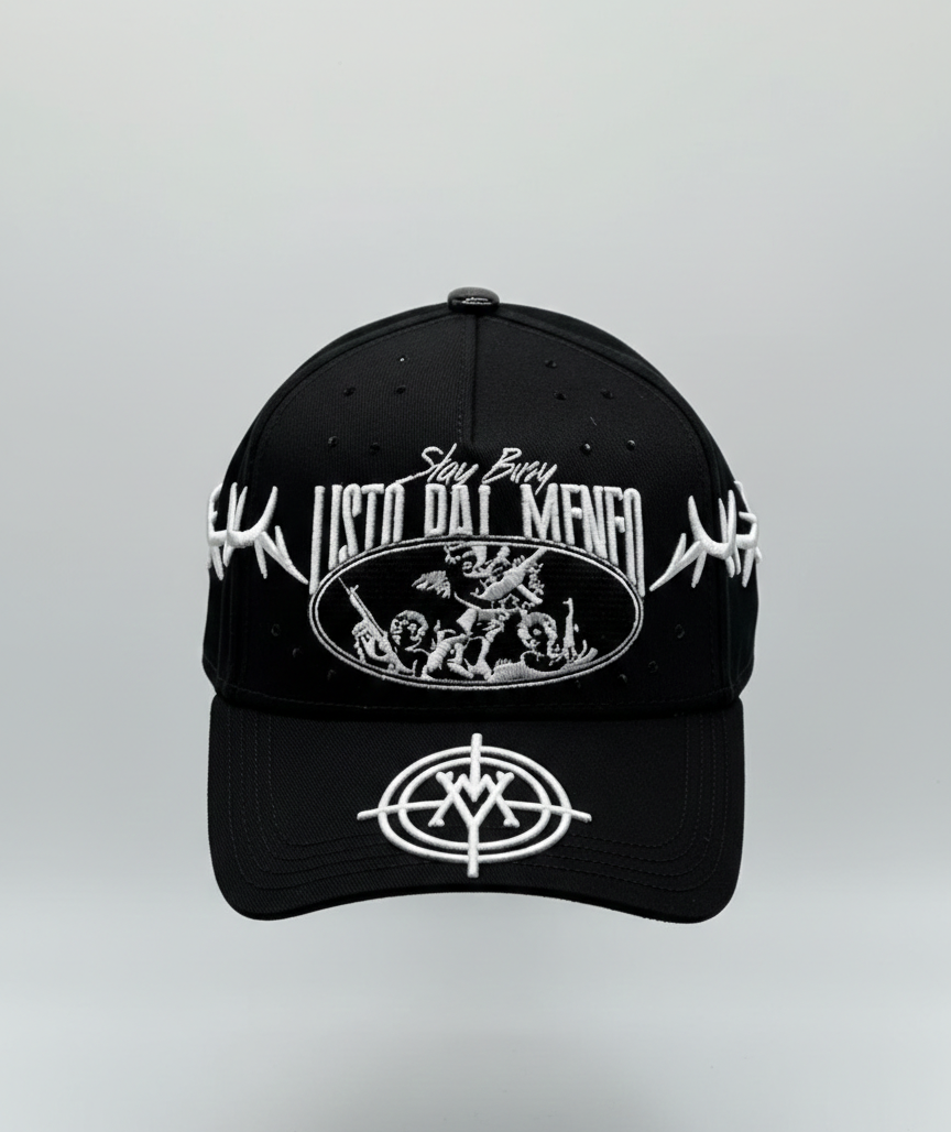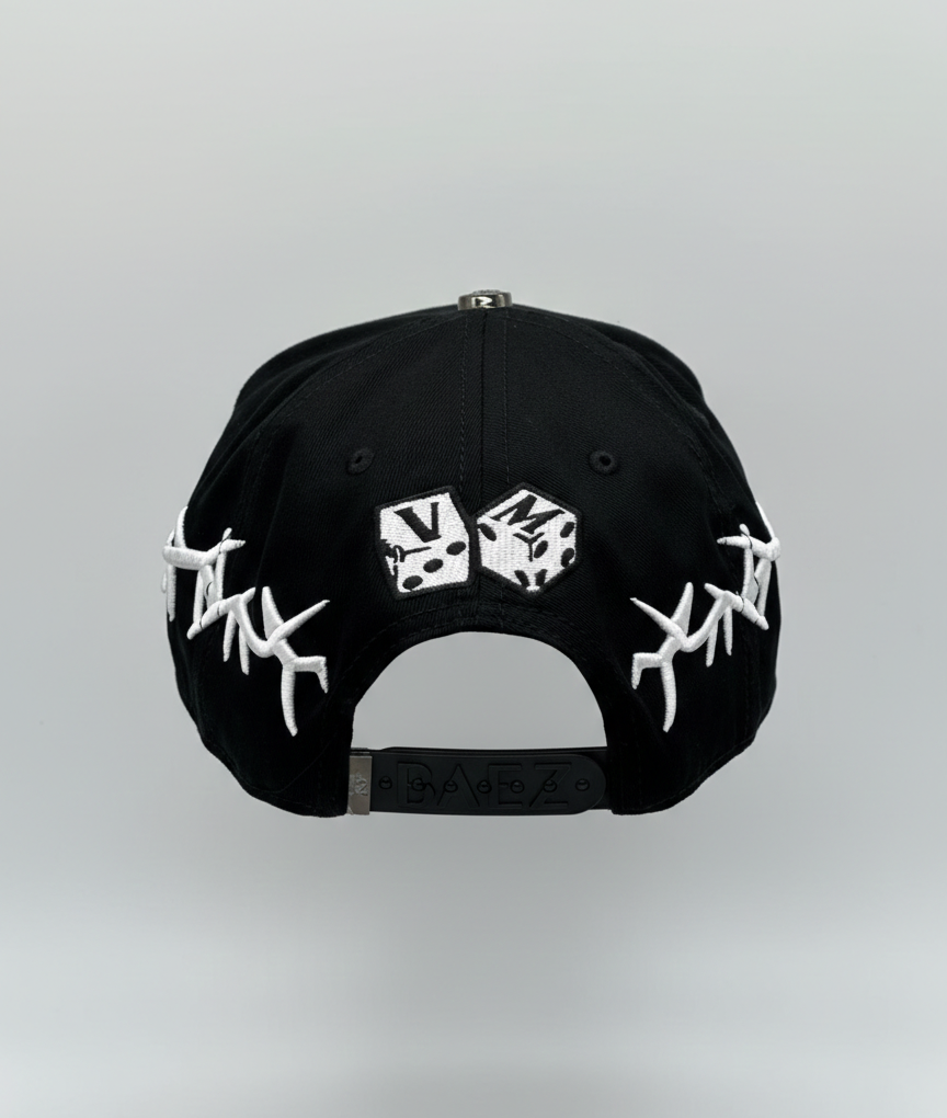 Edición limitada en color negro con bordado premium de alta definición. Modelo snapback unitalla con visera curva y costuras reforzadas. Diseño exclusivo con detalles frontales y laterales icónicos de Baez y VM. Cómoda, ligera y 100% original, ideal para completar tu estilo urbano.
